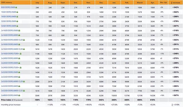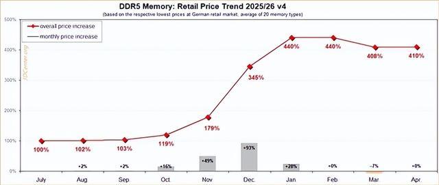 据3DCenter监测数据,德国市场DDR5内存套条均价已反弹至去年7月水平的410%,今年3月出现的短暂降价被证实仅为昙花一现。